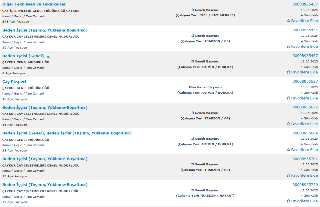 4-Her aday, Çay işletmeleri Genel Müdürlüğünün Artvin,Rize,Trabzon,Giresun ilerindeki ilanlardan yalnızca bir işyeri ve bir mesleğe başvuru yapacak olup, birden çok işyeri için talepte bulunanların iş başvuruları kabul edilmeyecektir.