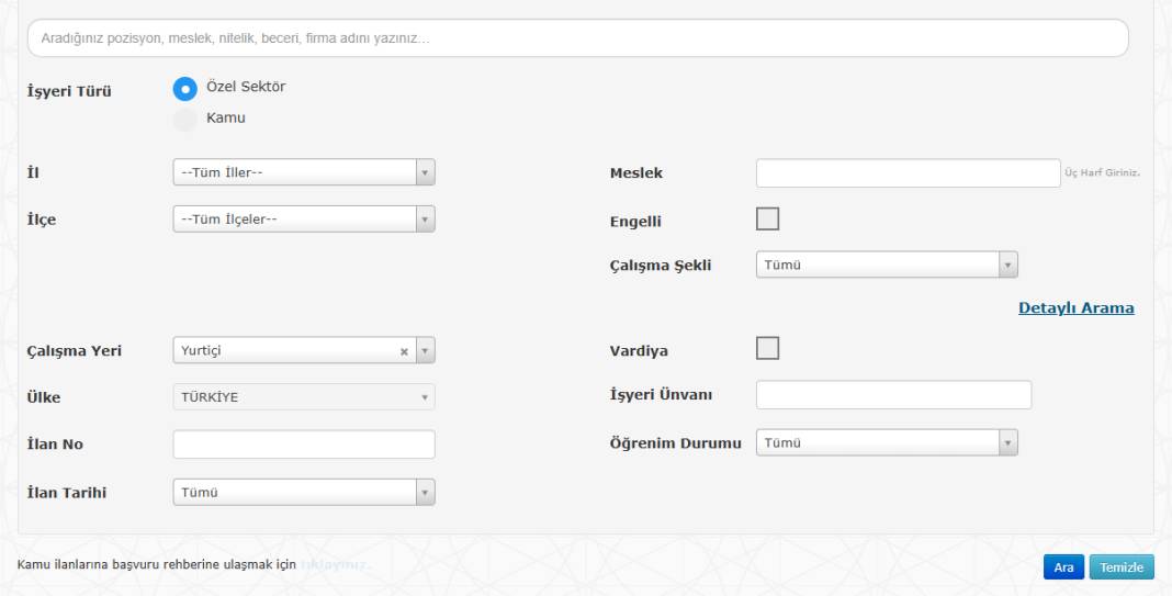 Kamu ilanlarına başvuru yapacaksanız sol üstte KAMU seçeneğini işaretleyip ARA butonuna tıklayabilirsiniz.